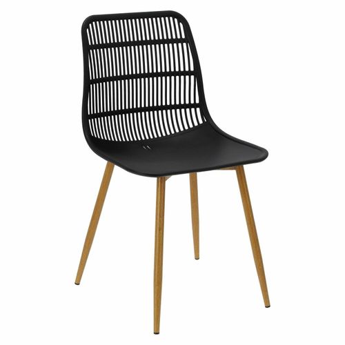 KRZESŁO KLAUS wyróżnia modna i nowoczesna forma, która spotyka się z uniwersalną funkcją. Siedzisko krzesła, wykonane zostało z wysokiej jakości polipropylenu w odcieniu klasycznej czerni, dzięki czemu jest ono wyjątkowo łatwe w pielęgnacji i utrzymaniu w czystości. Oparcie posiada liczne charakterystyczne otwory, które spełniają rolę dekoracyjną, a tym samym zapewniają wentylację podczas użytkowania. Dzięki zastosowaniu ergonomicznego profilowania siedziska krzesło zapewnia wysoki poziom komfortu i wygody. Podstawę natomiast stanowią 4 metalowe, smukłe nogi w okleinie imitującej drewno. Dodatkowo zakończone zostały one podkładkami w kolorze czarnym, dzięki czemu całość jest stabilna i nie przesuwa się w czasie siedzenia. Minimalistyczny design, nawiązuje do stylu skandynawskiego, jednak krzesło Klaus będzie równie dobrze wyglądać w aranżacjach nowoczesnych i industrialnych. Dzięki swojej uniwersalności sprawdzi się nie tylko w domowej kuchni czy jadalni, ale także w przestrzeniach takich jak sale konferencyjne czy poczekalnie.