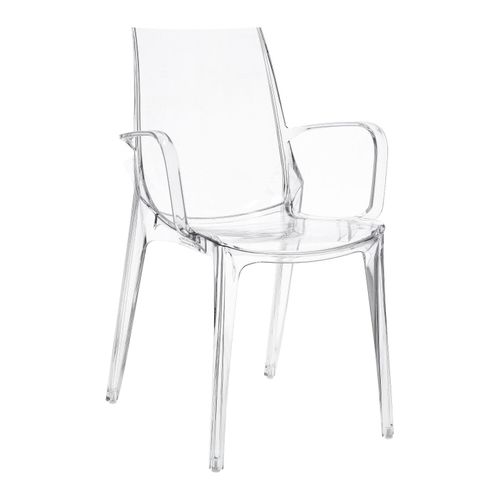 Krzesło Vanity to kolejna odsłona niezwykle modnych transparentnych siedzisk. To definicja współczesnego stylu modern glamour, który na stałe zagościł w europejskich jadalniach i sypialniach. Jeśli poszukujesz oryginalnego krzesła do stołu lub funkcjonalnego siedziska do toaletki, Vanity jest propozycją właśnie dla Ciebie! Wykonane z poliwęglanu, w dwóch wersjach, bez lub z podłokietnikami gwarantuje łatwość w czyszczeniu i wytrzymałość. Materiał, z którego wykonano siedzisko, umożliwia użytkowanie również na zewnątrz, dzięki czemu Vanity może stać się oryginalnym krzesłem na balkon lub do ogrodu. Możliwość sztaplowania aż do 8 sztuk na sobie sprawdzi się szczególnie we wnętrzach komercyjnych takich jak restauracja lub hotel.
