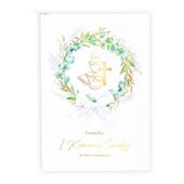Pudełko na wszystkie pamiątki komunijne to ozdobne pudło rozmiarów A4, w którym zmieszczą się wszystkie życzenia, kartki i drobne pamiątki. W środku znajduje się religijna książeczka pełna cytatów z miejscem na pamiątkowy wpis lub życzenia. Pudełko zamykane jest wiązaniem. Wykonane zostało z grubej tektury i foliowanego papieru, by służyć jak najdłużej.