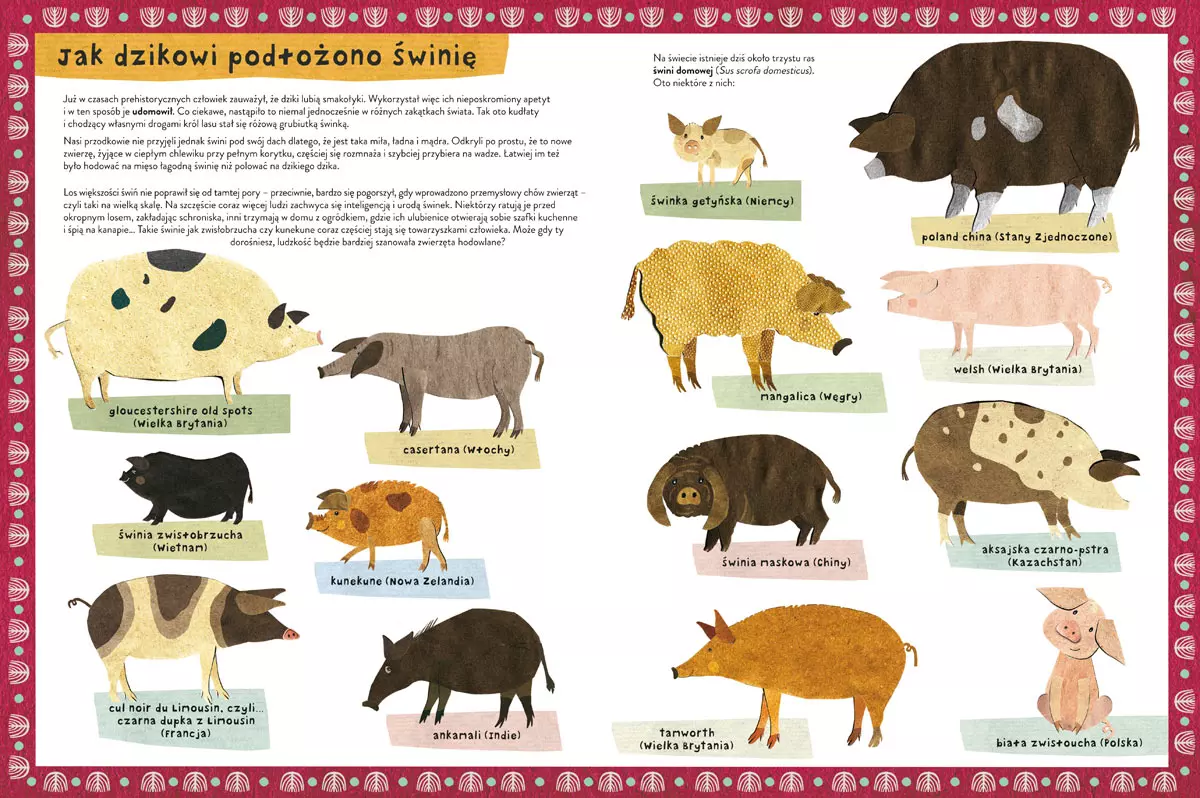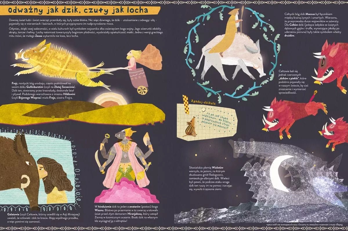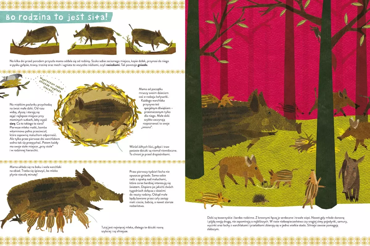 W swojej niezwykłej wycinankowej opowieści autorka ukazuje miejsce dzika w wierzeniach naszych przodków, jego miłość do najbliższych krewnych (czy wiedzieliście, że lochy śpiewają warchlakom kołysanki?), zaskakująco podobne do ludzkich zwyczaje (na przykład ścielenie łóżka), a także skomplikowany język. Na tym jednak nie koniec, ponieważ dzikowi towarzyszą tu jego kuzyni, jak choćby uwielbiany przez dzieci guziec czy świnia – być może najmądrzejsze i najbardziej uczuciowe spośród znanych nam zwierząt.