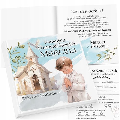 Każda księga jest unikalna, dzięki personalizowanej stronie powitalnej i grafice na okładce. Możesz wybrać wzór ankiet komunijnych, które będą dodane bezpłatnie, czyniąc ją jeszcze bardziej wyjątkową i dostosowaną do Twoich preferencji.