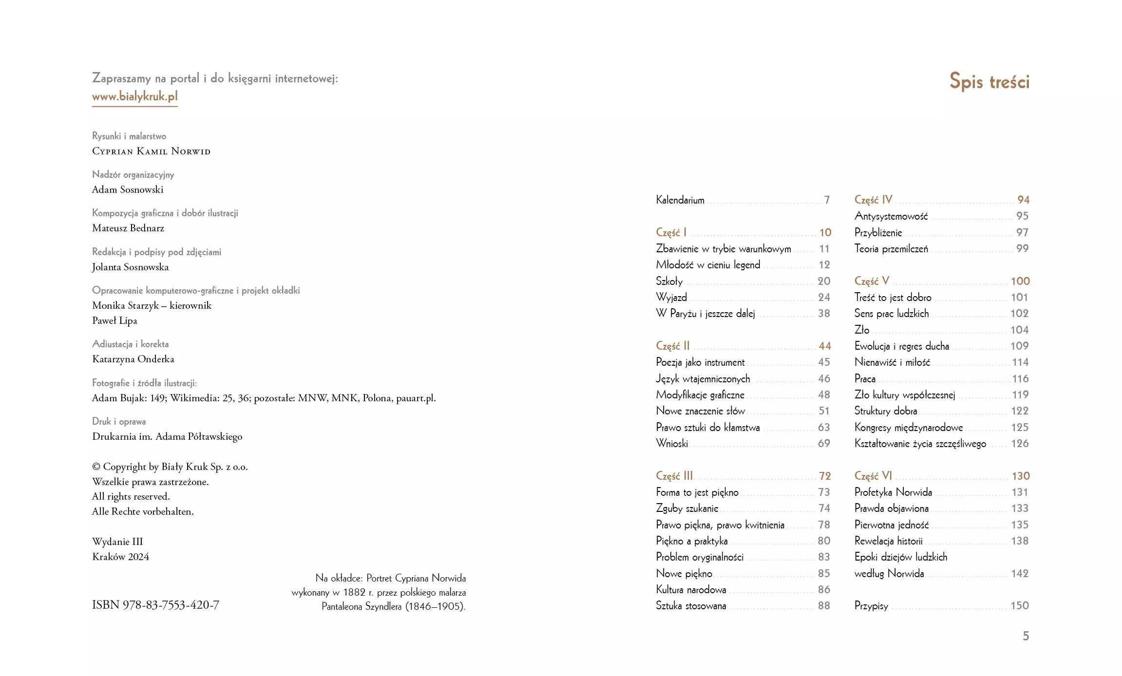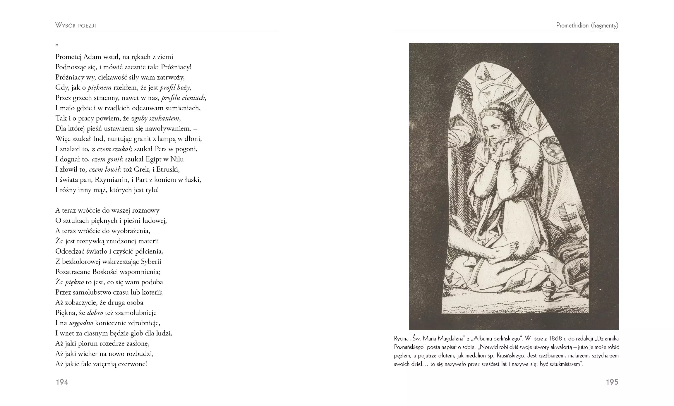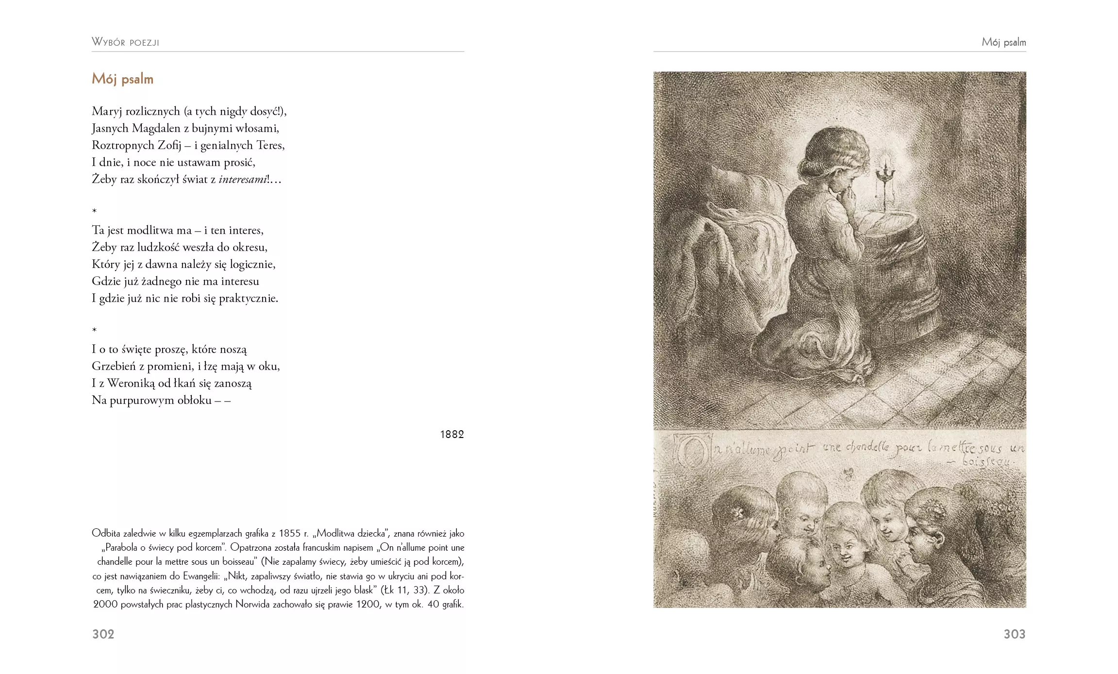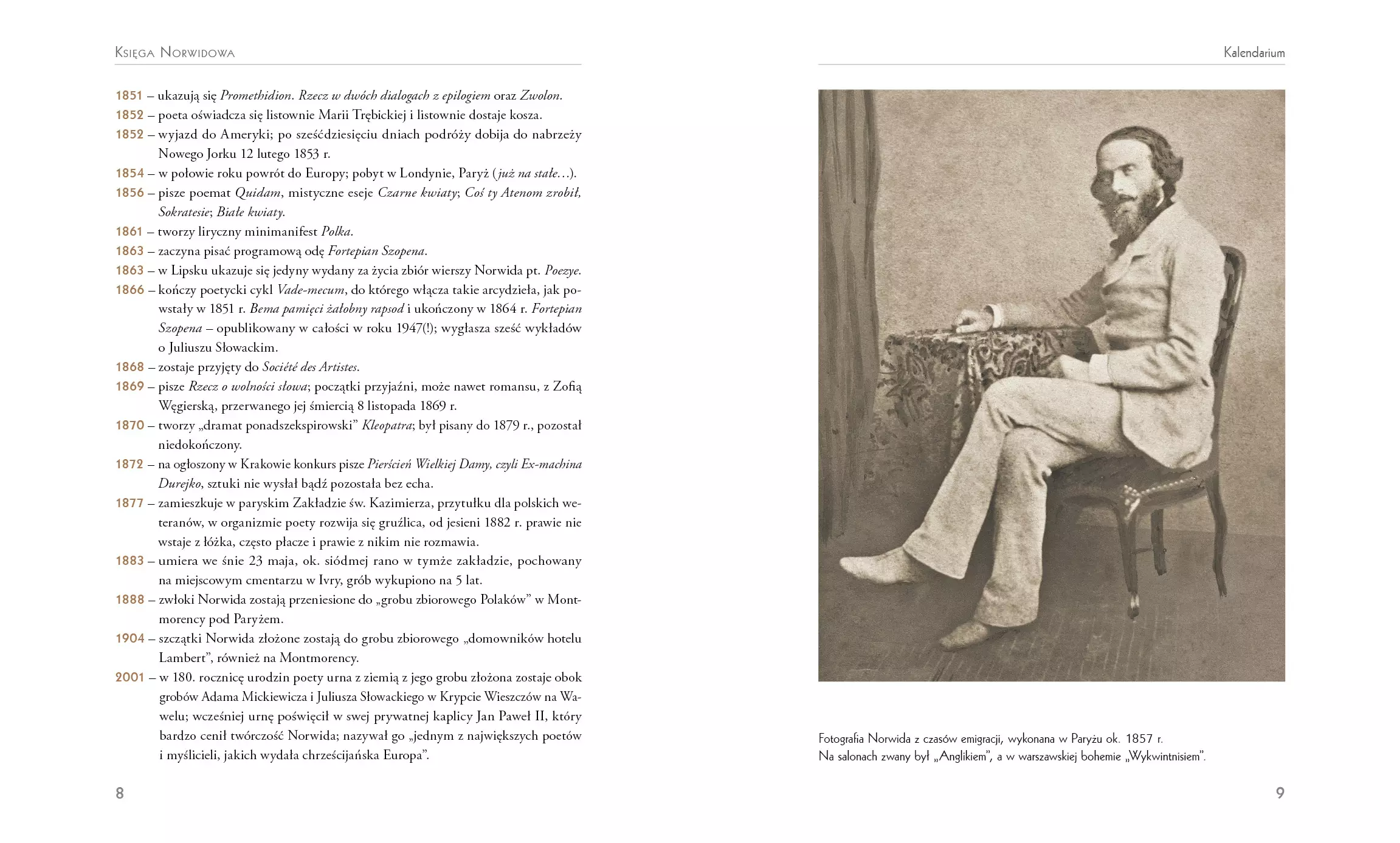 Ten rodem z mazowieckiego dworku szlacheckiego artysta mówił sam o sobie – jakże słusznie! – że jest sztuk-mistrzem, a więc twórcą korzystającym z wielu narzędzi: słowa, pędzla, piórka, rylca, a nawet dłuta. W istocie Cyprian Kamil Norwid był artystą tyleż wybitnym, co wszechstronnym. Zostawił po sobie nie tylko wiersze, eseje, dramaty i poematy, ale też grafiki, akwarele, obrazy olejne, rzeźby, a przede wszystkim ponad tysiąc rysunków! „Księga Norwidowa” stara się oddać kunszt i wielowymiarowość sztuki tego nadzwyczajnego twórcy. Choć różnorodny w formie, Norwid niezmienny był w poglądach i upodobaniach. Dzieła swoje podporządkowywał zasadom piękna, a stawiał je w służbie Boga i Ojczyzny. Bacznie obserwował świat jego twórczość, zwłaszcza rysownicza, jest kapitalnym dokumentem czasów, w których przyszło mu żyć. Czasów dla niego bardzo ciężkich, można powiedzieć nieszczęsnych, tak z powodu niespełnionych miłości, jak i niedocenienia za życia jego sztuki oraz myśli. Zwłaszcza to ostatnie trzeba mocno podkreślić, ponieważ Norwid był prawdziwym myślicielem, na wzór Sokratesa czy Arystotelesa, a nie tylko intelektualnym nowinkarzem. Przenikał duszę człowieka słowem i właśnie myślą, która nie wszystkim była w smak. Jednak do dzisiaj pozostała celna i aktualna. A nawet – z czasem nabiera coraz większej aktualności. Jednym z wybitnych znawców twórczości Norwida jest dr Bohdan Urbankowski (sam poeta i filozof), który w części biograficznej, poprzedzającej wybór poezji, rysunków i grafik, przybliża czytelnikowi zarówno życie artysty, jak i jego twórczość. Czyni to jak zwykle z typowym dla niego znawstwem i polotem. „Księgę Norwidową” uzupełnia 130 ilustracji. Sejm polski ustanowił, w 200-lecie urodzin, rok 2021 Rokiem Norwidowskim.