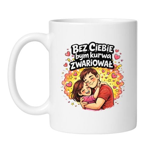 Zamów kubek „Bez Ciebie bym kurwa zwariował” i podaruj śmieszny kubek na prezent, który naprawdę trafia w emocje.