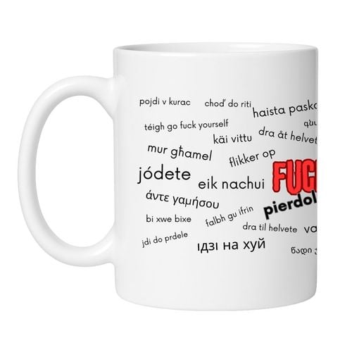 Choć przekaz jest mocny, kontekst decyduje o odbiorze. Ten kubek z napisem fuck you w różnych językach często wybierany jest jako: