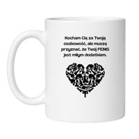 Szukasz kubka z nadrukiem na prezent dla chłopaka, narzeczonego lub męża? Ten wzór to zabawna alternatywa dla nudnych tekstów o „miłości na zawsze”. Jest uczucie, jest szczerość… i jest szczypta (ocenzurowanego) pieprzu.