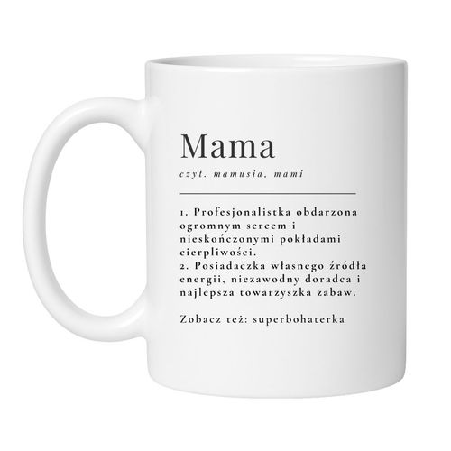 Kubek z definicją mamy, który rozczuli każdą kobietę, co łączy bycie pielęgniarką, kucharką, logistykiem, psychologiem i przyjaciółką – często w ciągu jednego dnia. To idealny prezent dla mamy, która nigdy nie ma wolnego, ale zawsze ma czas dla Ciebie. Pełen ciepła, wdzięczności i uśmiechu – ten kubek z napisem „Mama – zobacz też: superbohaterka” to coś więcej niż ceramika. To małe „dziękuję”, które mówi wszystko.
