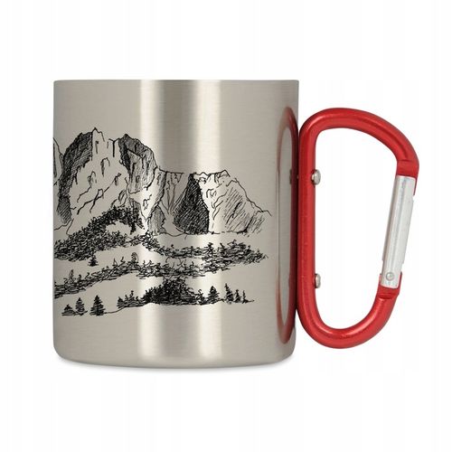 Kubek wykonany jest z wysokiej jakości metalu, z podwójnymi ściankami zapewniającymi dodatkową wytrzymałość. Jego konstrukcja z uchwytem typu karabińczyk i czerwoną klamrą umożliwia przypięcie go do paska lub plecaka, co ułatwia transport i oszczędza miejsce.