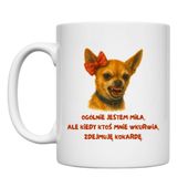 Bycie miłą jest fajne… do czasu. Ten śmieszny kubek z chamskim napisem i wkurzonym pieskiem to wizytówka dla kobiet, które nie boją się pokazać swojej drugiej twarzy. Idealny dla fanek kubków z zabawnymi napisami, które łączą humor, dystans i nutkę wulgarności w najlepszym wydaniu. Jeden rzut oka na nadruk i każdy będzie wiedział, żeby nie testować Twojej cierpliwości.