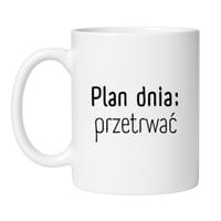 Kubek Plan dnia: przetrwać to śmieszny kubek do pracy z ironicznym napisem, który humorystycznie opisuje codzienny plan dnia wielu pracowników.
