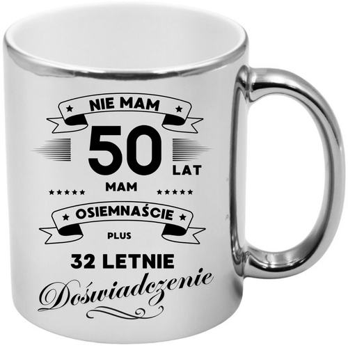 Kubek w kolorze srebrnym błyszczącym z czarnym nadrukiem (z obu stron kubka)