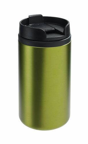 Na zewnątrz stal nierdzewna, wewnątrz plastik, plastikowa przykrywka z bezpiecznym zamknięciem otworu do picia, z antypoślizgową podstawą, pojemność ok. 290 ml,