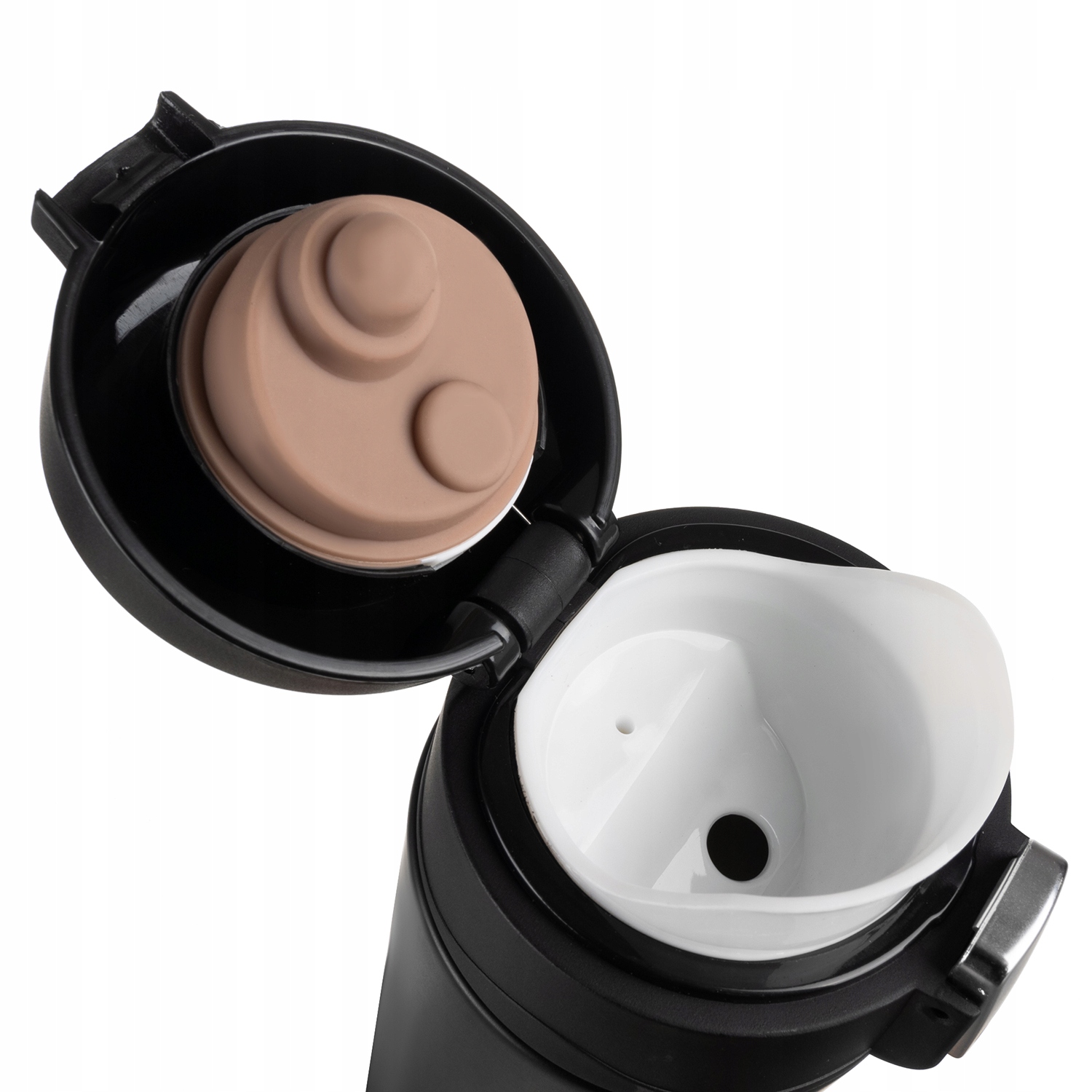 Kubek wyposażony jest w blokadę automatycznego otwierania, która zapobiega przypadkowemu otwarciu podczas transportu. To praktyczne rozwiązanie zwiększa bezpieczeństwo i minimalizuje ryzyko rozlania napoju.