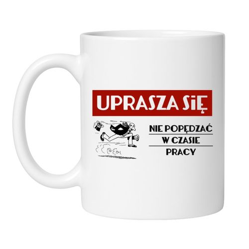 Masz już dość wiecznego pośpiechu, deadline’ów i ludzi, którzy myślą, że praca to sprint? Ten kubek z napisem „Uprasza się – nie popędzać w czasie pracy” to biurowa tarcza ochronna i żart w jednym. Śmieszny kubek do pracy z ironicznym przesłaniem powie wszystko za Ciebie – bez podnoszenia głosu. Dla tych, którzy wiedzą, że tempo to sprawa indywidualna, a kawa to świętość.