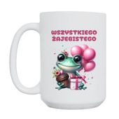 Masz dość nudnych prezentów? Ten śmieszny kubek z żabą, balonami i babeczką powie wszystko za Ciebie: życzę Ci po prostu wszystkiego żajebistego. Idealny kubek na urodziny, imieniny, walentynki czy po prostu bez okazji, gdy chcesz, żeby obdarowany parsknął śmiechem przy porannej kawie.