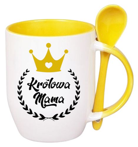 Kubek w kolorze białym z żółtym uchem, wnętrzem i łyżeczką