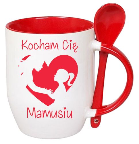 Kubek w kolorze białym z czerwonym uchem, wnętrzem i łyżeczką