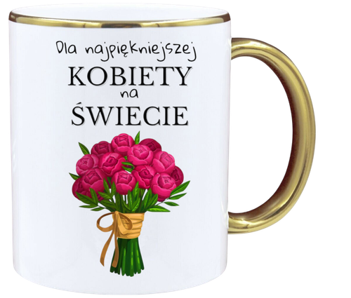 Kubek w kolorze białym ze złotym błyszczącym uchem i rantem.