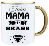 Kubek w kolorze białym ze złotym błyszczącym uchem i rantem.