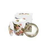 Kubek zdobiony motywem sikorki wśród kwiecisto-liściastych gałązek. Ciemna zieleń i stonowane szarości w otoczeniu pastelowego różu idealnie kompnują się z bielą porcelany.