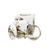 Kubek zdobiony motywem leśnych sójek w delikatnych pastelowych i ciepłych brązach.