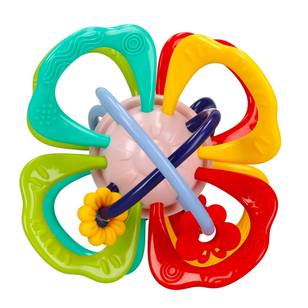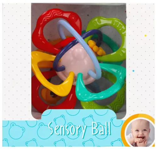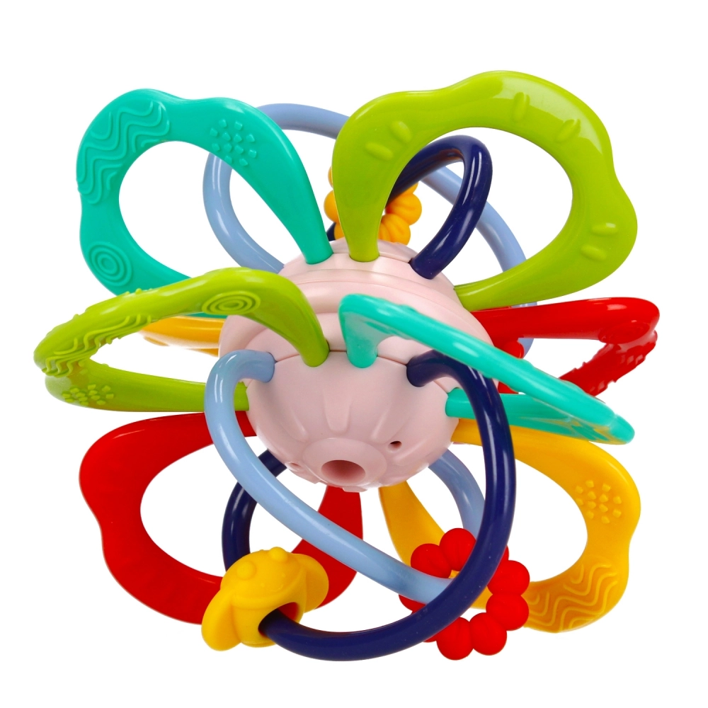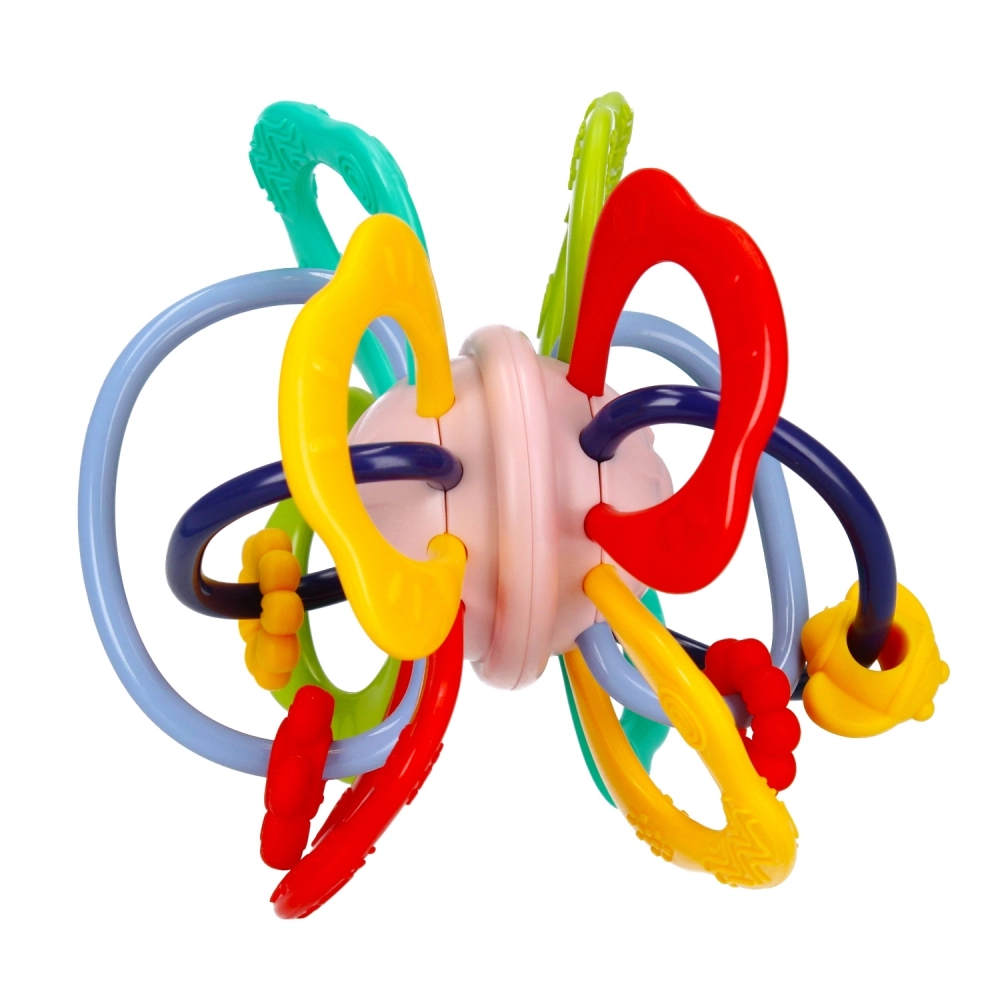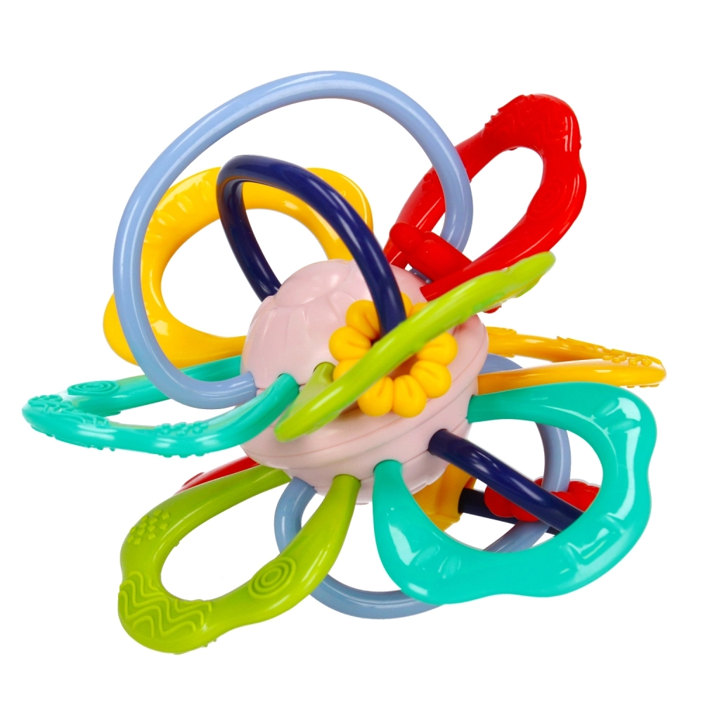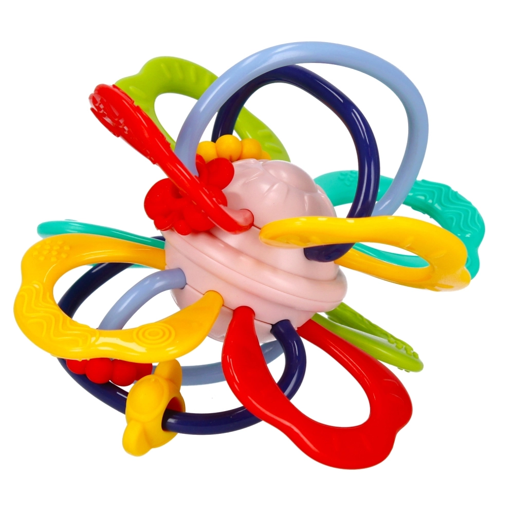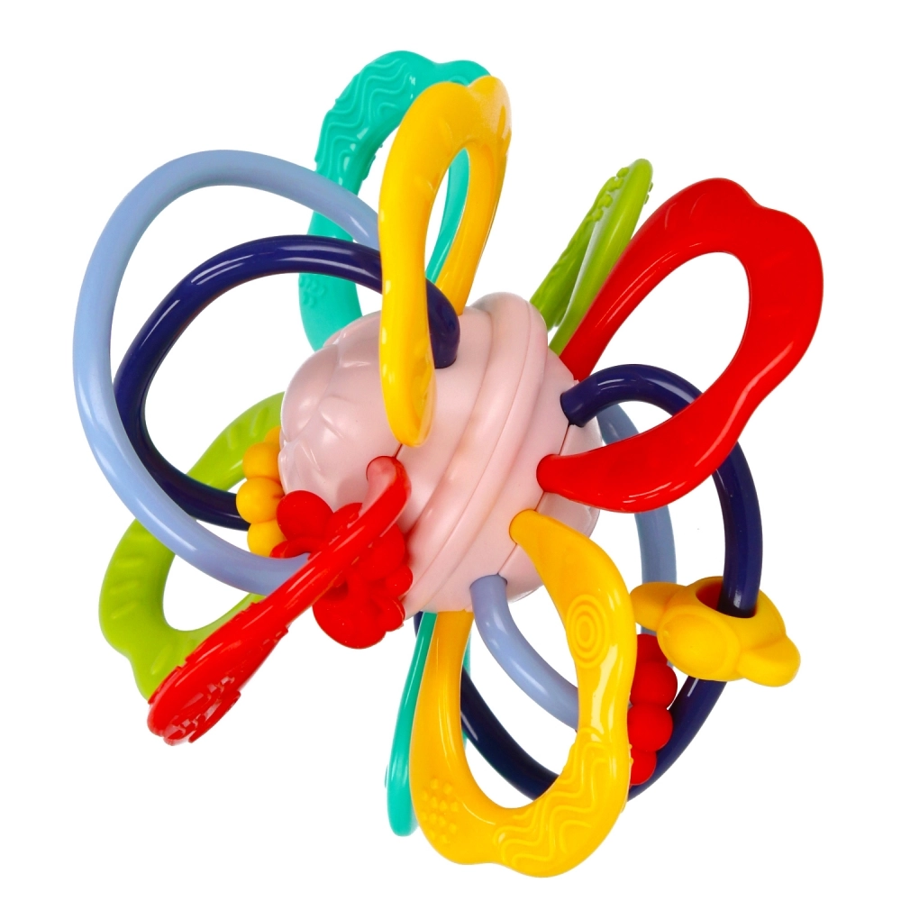 Zabawa kulą niesie wielowymiarowe korzyści dla maluszka – bezsprzecznie gwarantuje rozwijającą zabawę, jak i przynosi ulgę w trudnym okresie ząbkowania. Ten wielobarwny gryzak, skonstruowany z miękkich obręczy o różnej grubości i fakturze, doskonale nadaje się także do nauki chwytania, manipulowania, pobudzając przy tym zdolności manualne i zmysł dotyku. Bogata gama kolorystyczna aktywizuje zmysł wzroku oraz percepcje. Zabawkę bez trudu maluch może utrzymać w rączce, potrząsać, by wydawała dźwięki oraz obracać kulę, by poruszyć osadzone na niej pierścienie. Odgłos click- clok uatrakcyjnia tą formę aktywności. Dodatkowe elementy, jak kółeczka, czy okręgi - kwiatuszki okalające obręcze, skłaniają dziecko do ich przesuwania wzdłuż nich, absorbują uwagę na długo, ucząc precyzji i wytrwałości. Zabawka bez reszty angażuje malucha już od 6 m-ca. Zabawka wykonana z najwyższej jakości, bezpiecznych materiałów bez ftalanów, zgodna z normą EN-71 oraz CE.