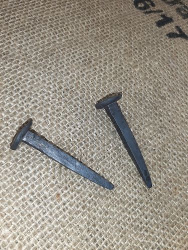 Kuty ręcznie gwóźdż stalowy. Idealne uzupełnienie do wieszaków i haków oferowanych na innych aukcjach. Łeb kulisty podkreśla ich rustykalny charakter dodatkowo pełniąc rolę ozdobną