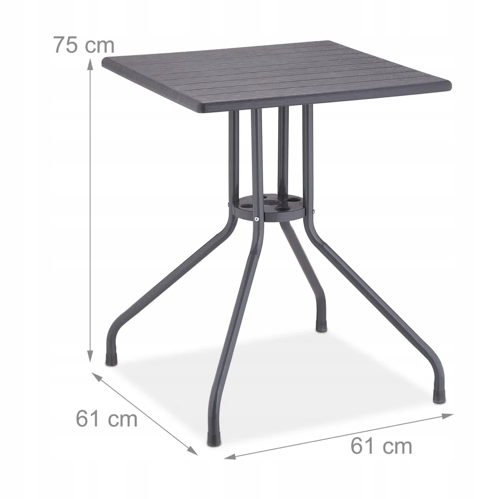 Stół ogrodowy w szczegółach- Wymiary wys. x szer. x gł.: ok. 75 x 61 x 61 cm