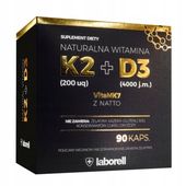 Suplement diety Laborell Witamina K2 MK7 + D3 to wysokiej jakości produkt, który zawiera witaminę K w jej najlepiej wchłanialnej postaci - K2 MK7 oraz witaminę D3 (cholekalcyferol). Witaminy te pełnią szereg ważnych ról w organizmie i pomagają mu zachować prawidłowe funkcjonowanie. Zaletą produktu od Laborell jest jego prosty skład, pozbawiony zbędnych dodatków, konserwantów czy barwników. Ponadto jest on odpowiedni dla wegan i wegetarian, gdyż zawiera kapsułkę z roślinnych surowców.