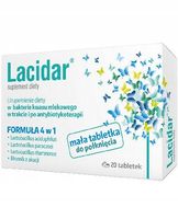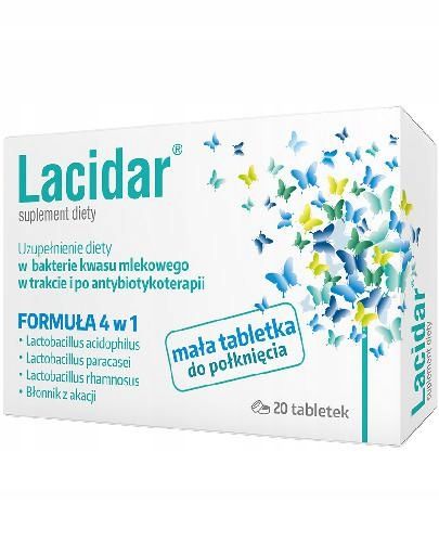 Lacidar to suplement diety, który chroni przewód pokarmowy w trakcie przyjmowania antybiotyków. Zawiera bakterie kwasu mlekowego, które wspierają układ pokarmowy podczas choroby. Tabletki pomagają odbudować florę bakteryjną układu trawiennego. Mogą je zażywać dzieci od 3. roku życia i dorośli.
