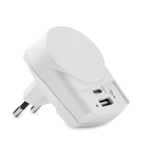 Europejska ładowarka z 2 portami UBS (Type-C i Type-A).