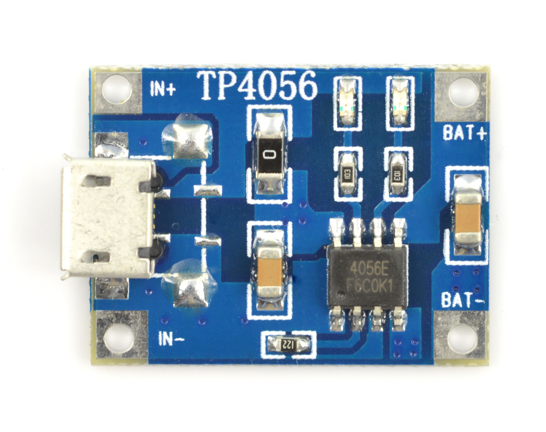 Maksymalny prąd ładowania wynosi 1000 mA. Układ zasilany jest poprzez złącze microUSB lub za pomocą przewodów podłączonych do wejść IN+ oraz IN-.