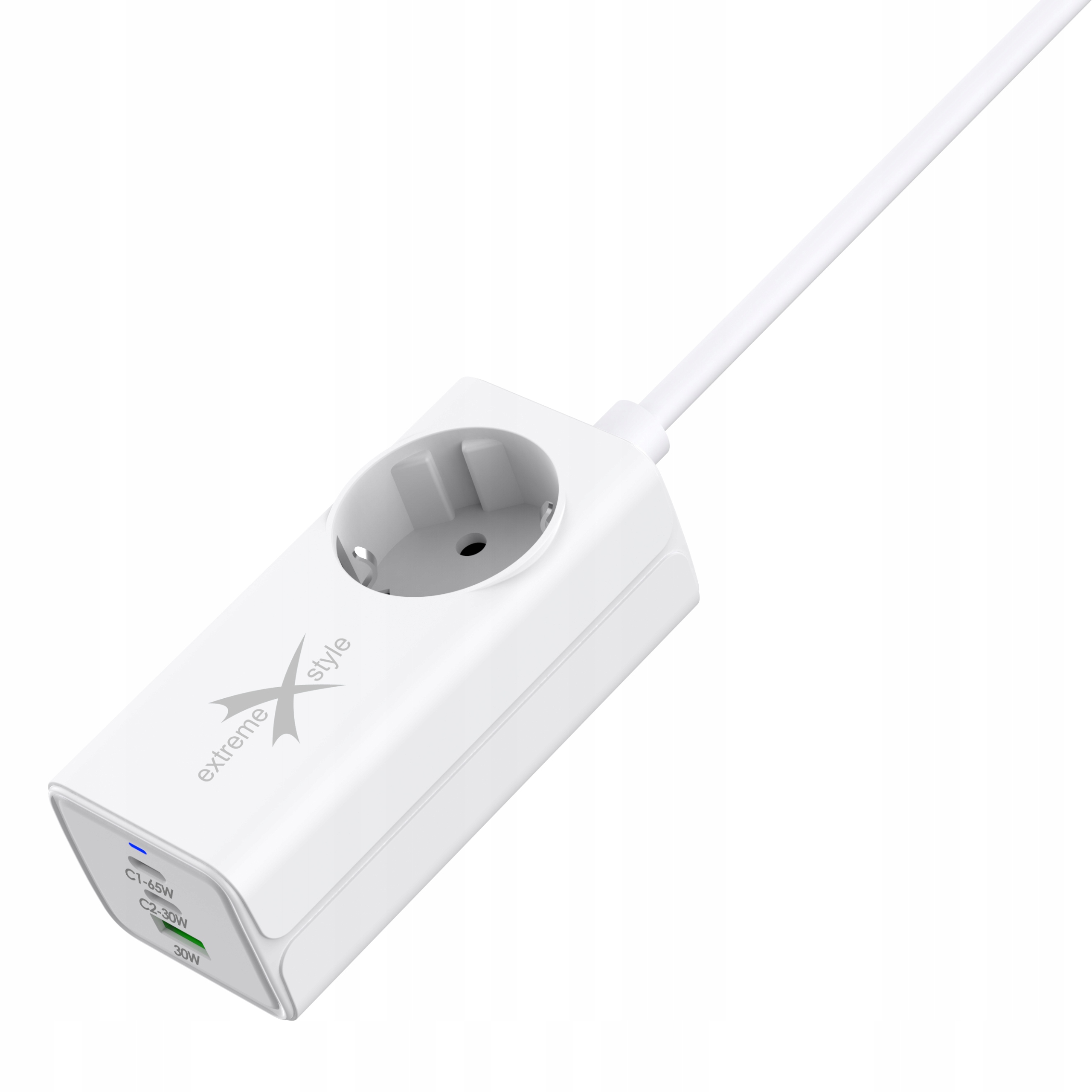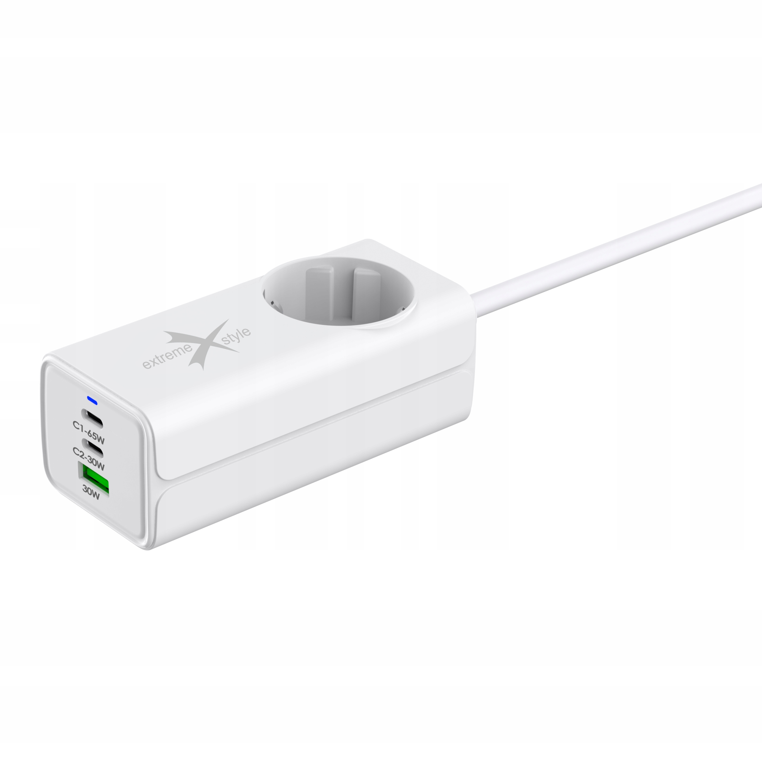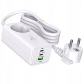 Ładowarka posiada trzy porty: USB-A i 2 x USB-C oraz dodatkowo gniazdko 240 V. Jej całkowita moc wyjściowa wynosi 65 W.