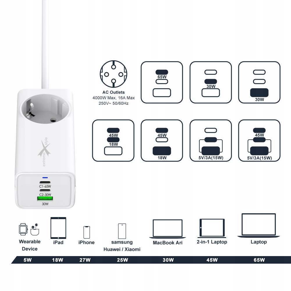 Jedną z głównych zalet tej ładowarki jest szybkie ładowanie. Wyposażona w dwa porty USB-C oraz jeden port USB-A, a także gniazdko 240 V, ma całkowitą moc wyjściową wynoszącą 65 W. Obsługuje popularne standardy szybkiego ładowania, takie jak Power Delivery, Quick Charge QC4.0+ oraz AFC (Samsung), co oznacza, że szybko naładujesz zarówno smartfony, jak i laptopy.