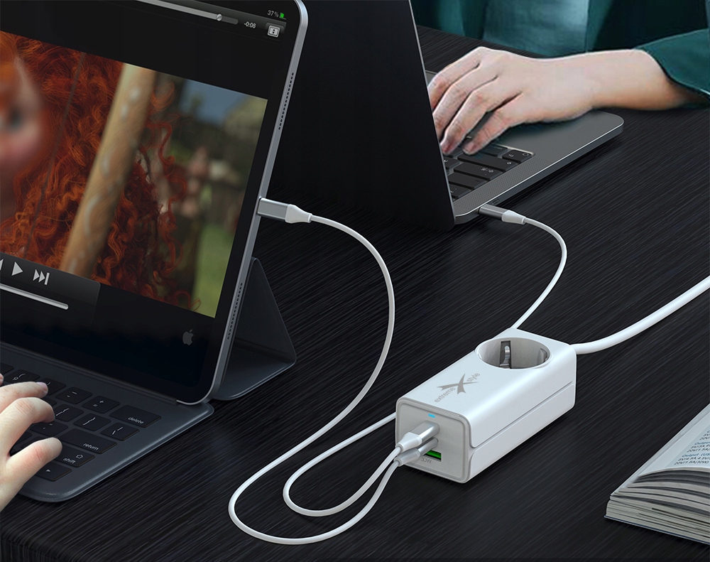 Ładowarka rozpoznaje automatycznie podłączony sprzęt, a następnie dobiera parametry ładowania. Dzięki technologii GaN ładowarka oszczędza akumulator, wydłużając jego żywotność.