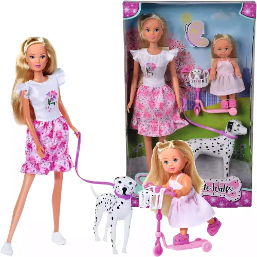 Steffi Love Lalki Steffi i Evi na spacerze z psem Została stworzona przez bardzo cenioną i popularną firmę Simba, która od lat projektuje zabawki dla dzieci, dbając o ich wysoką jakość. Pochodzi ona z serii lalek Steffi Love uwielbianej przez dziewczynki. Lalka Steffi ma niebieskie oczy i długie blond włosy. Ubrana jest w biało-różową sukienkę w kwiecisty wzór. Na nogach ma białe sportowe buciki. Lalka ma ruchome ręce, nogi i głowę, dzięki czemu można ją ustawiać w różne dynamiczne pozy i wymyślać historii. Laleczka Evi ma niebieskie oczy i długie blond włosy. Ubrana jest w biało-różową sukienkę w pasy. Na nogach ma różowe sandały. Jeździ na różowej hulajnogę, która jest wyposażona w biały koszyczek. Steffi wraz z córeczką Evi opiekują się psami rasy dalmatyńczyk. Steffi trzyma na fioletowym smyczy psa, a Evi jeździ ze szczeniakiem na hulajnogę. Lalka Steffi z pewnością przypadnie do gustu każdej dziewczynce uwielbiającej lalki. wysokość lalki Steffi: ok. 30 cm wysokość lalki Evi: ok. 11 cm wysokość figurki pieska: ok. 11 cm zabawka wykonana z plastiku lalka ma ruchome ręce, nogi i głowę kolory mogą różnic się od przedstawionych na zdjęciach kod producenta: 105733605 wymiary opakowania: 32,5 x 20 x 5 cm produkt odpowiedni dla dzieci powyżej 3 roku życia