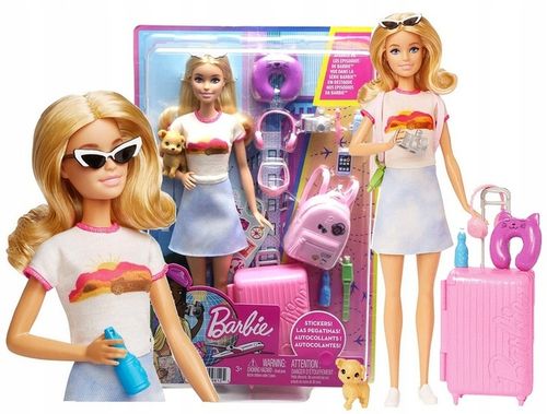 ✅ Elementy zestawu: akcesoria podróżne, lalka Barbie, naklejki, plecak, szczeniaczek, ubrania, walizka