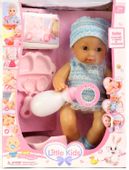 Uroczy bobas, który pije z butelki i siusia do nocnika. Dodatkową atrakcją są 4 funkcje dźwiękowe, dzięki którym zabawa lalą jest jeszcze przyjemniejsza. W skład zestawu wchodzi lalka o wysokości około 30 cm, ubrana w mięciutkie dzianinowe ubranko w kolorze niebieskim oraz akcesoria: