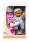 Uroczy bobas, który pije z butelki i siusia do nocnika. W skład zestawu wchodzi lalka o wysokości około 29 cm, ubrana w mięciutkie dzianinowe ubranko w kolorze niebieskim oraz akcesoriów: