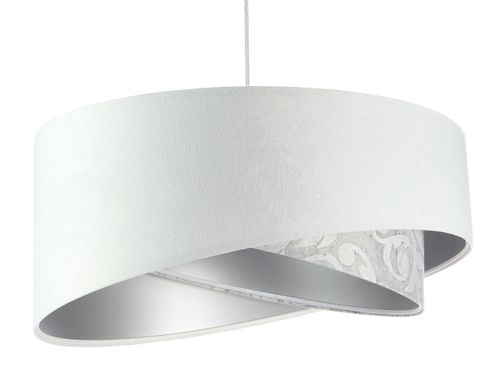 Lampa wisząca ALBIT stworzona została z myślą o wytwornych wnętrzach w stylu glamour, jak i również wnętrzach urządzonych w stylu nowoczesnym oraz vintage. To propozycja skierowana do osób szukających elementów wyposażenia, które uzupełnią wnętrze mieszkania. Asymetryczna konstrukcja abażuru powoduje, że lampa do salonu przedstawia się niezwykle ciekawie. Połączenie bieli z uroczym wzorem oraz srebrnym wnętrzem tworzy śliczną kompozycję, która jest przyjemna dla oka. Abażur lampy wiszącej ALBIT skonstruowany został z miękkiej tkaniny welurowej, natomiast wnętrze zdobi srebrna apla o matowym wykończeniu. Abażur cechuje się dużą wytrzymałością na działanie promieniowania UV, dzięki czemu nie traci on swojego koloru podczas korzystania. Do lampy pasują żarówki E27 o maksymalnej mocy 60 Watt - można również zastosować żarówki LED. Lampa sprzedawana jest bez żarówki.