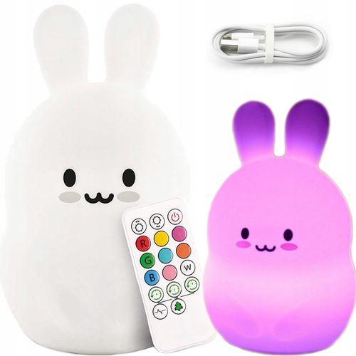 Zmień lampkę swojego dziecka z nudnego klosza i tradycyjnej żarówki na słodkiego króliczka, który będzie spełniał zarówno funkcje praktyczne jak i estetyczne. Twoje dziecko na pewno go pokocha! Lampkę wykonano z miękkiego silikonu przez co jest ona odporna na wszelkie uszkodzenia (panel LED nie ulega rozbiciu jak tradycyjna żarówka). Pilot do zdalnego sterowania pozwala zmienić kolor podświetlenia, tryb pracy, włączyć bądź wyłączyć urządzenie.
