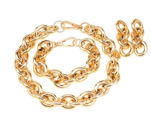 Łańcuszkowy komplet składa się z naszyjnika, bransoletki, kolczyków. Modny szeroki wzór łańcuszka. Naszyjnik długość 47 cm, szerokość 2,2 cm, grubość 0,6 cm Bransoletka długość 27 cm, szerokość 2,2 cm, grubość 0,6 cm Kolczyki długość 7 cm, szerokość 2,2 cm, grubość 0,6 cm Warstwa złota naniesiona w metodzie - PVD- napylanie próżniowe jonami tytanu, czy też azotkiem tytanu jest nowoczesną metodą nanoszenia powłok o bardzo dużej trwałości. * Pokryte jest w całości 4 - 8 mikronową warstwą 14K, 18K i 24K złota. * Warstwa złocenia pokryta jest lakierem jubilerskim, który zabezpiecza powłokę złota przed ścieraniem i nadaje wspaniały połysk * Biżuteria wykonana ze stali szlachetnej-należy do grupy stali o strukturze austenitycznej ( podobna chirurgiczna 316 L) : - jest hipoalergiczna i nie uczula, ponieważ nie emituje związków niklu do organizmu - nie koroduje, nie odbarwia się i długo cieszy swoim blaskiem - ścieralność uzależniona od noszenia i od pH ciała - nie wymaga specjalnej konserwacji jak biżuteria ze srebra, czy złota Ze względu na różne ustawienia monitorów oraz różną jakość wyświetlaczy zastosowanych w urządzeniach mobilnych, kolory przedstawione na zdjęciach mogą nieznacznie różnić się od rzeczywistych. Dokładamy wszelkich starań, aby na stronie Sklepu przedstawiać tylko realne zdjęcia produktów, jak najbardziej zbliżone do rzeczywistości.