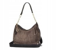 Damska listonoszka zamykana jest na zamek błyskawiczny. Jednokomorowy model posiada w środku jedną kieszonkę zamykaną na zamek. Dodatkowo z tyłu torebki znajduję się zasuwana kieszonka. Charakteru całości dodają frędzle w przedniej części. Listonoszka wyposażona została w odpinany regulowany pasek wykonany z materiału oraz mniejszy zrobiony ze skóry w kolorze torebki.