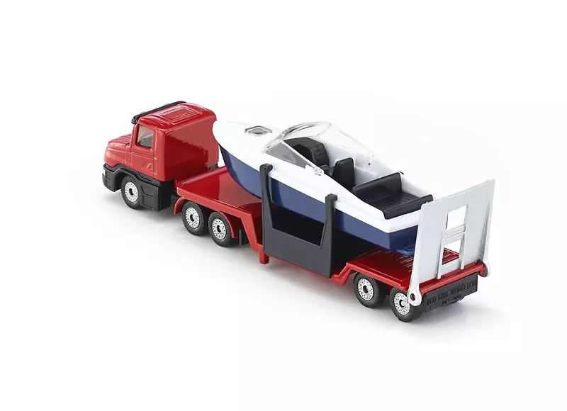 Stabilna, biało-granatowa laweta z elegancką łodzią. Zabezpieczenia boczne i tylne, gumowe opony i wysoka jakość materiałów zapewniają bezpieczny transport łodzi po różnych powierzchniach. Zestaw idealny dla miłośników samochodów ciężarowych i wodnych wojaży. Model urozmaici wspólną zabawę i będzie wzbogaceniem niejednej kolekcji.