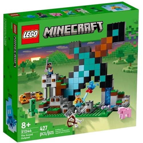 LEGO® Minecraft Bastion miecza (21244) wykorzystuje kultowy diamentowy miecz jako superfajną bazę, gdzie dzieci mogą zbudować miejsce odpoczynku i wybuchowych walk. Dzieci budują bazę w kształcie gigantycznego miecza na zboczu góry i bronią się przed atakami mobów. W bazie znajduje się stół, ciastko i szafa grająca, która „odtwarza” muzykę. Na zewnątrz na straży stoją figurki strażnika i wartownika. Wsparcie stanowią też dwa działka z przodu bazy. W zestawie są też wrogie moby, Creeper™ i szkielet. Do przyjaciół należy natomiast świnia i otuszek z foliowymi skrzydłami. Dźwignia na dole wieży wyzwala eksplozję, która prowadzi do zawalenia się części konstrukcji. Dodatkową cyfrową zabawę zapewnia aplikacja LEGO Builder, gdzie można powiększać i obracać model podczas budowy.