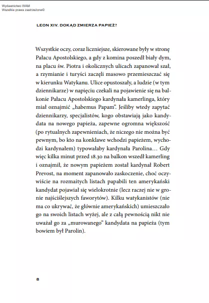Quo vadis, Leo XIV? Dokąd zmierzasz, Leonie XIV? Czy pontyfikat pierwszego w historii papieża z USA będzie kamieniem milowym w dziejach Kościoła, podobnie jak pontyfikat jego imiennika Leona XIII? Jakie myśli przewodnie i kierunki działań papieża można wyróżnić po pierwszych miesiącach na Stolicy Piotrowej? 8 maja 2025 roku nad dachem Kaplicy Sykstyńskiej uniósł się biały dym. Kardynałowie zgromadzeni na konklawe dokonali wyboru 267. papieża, którym został Amerykanin – Robert Francis Prevost, augustianin. Tomasz P. Terlikowski, od początku śledzący bacznie pierwsze kroki Leona XIV i wsłuchujący się uważnie w jego wypowiedzi, przybliża sylwetkę kolejnego Następcy św. Piotra i zastanawia się, które kwestie są i będą dla Ojca Świętego kluczowe w jego posłudze. To nie tylko książka o papieżu, ale również o czasach zmian, których doświadczamy, i o rerum novarum – rzeczach nowych, które w dzisiejszym świecie mogą znaczyć coś innego niż w czasach Leona XIII. „Światłem i mocą Ducha Świętego budujmy Kościół oparty na miłości Boga i będący znakiem jedności, Kościół misyjny, który otwiera ramiona na świat, głosi Słowo, pozwala, by go niepokoiła historia, i który staje się zaczynem zgody dla ludzkości. Razem, jako jeden lud, jako fratelli tutti, idźmy ku Bogu i miłujmy się wzajemnie”. – Fragment homilii Leona XIV podczas mszy św. inaugurującej pontyfikat Dr Tomasz Terlikowski, filozof i teolog, publicysta, tłumacz, pisarz i działacz katolicki. Przewodniczył komisji do zbadania sprawy o. Pawła M. w zakonie dominikanów. Był redaktorem naczelnym portalu oraz redaktorem naczelnym i dyrektorem programowym Telewizji Republika. Autor wielu książek: Rozdzieleni bracia. Szeptyccy, historia Polski i Ukrainy, Franciszek Blachnicki. Ksiądz, który zmienił Polskę, Ks. Tadeusz Isakowicz-Zaleski. Sumienie polskiego Kościoła. Od stycznia 2025 jest gospodarzem „Porannej Rozmowy” w RMF FM.