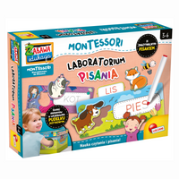 Laboratorium pisania polega na włożeniu elementów do pudełka Montessori. Kształty są niewidoczne, więc dziecko, umieszczając rączki w odpowiednich otworach, wyszukuje przedmioty tylko za pomocą dotyku. Celem jest umieszczenie każdego elementu we właściwym miejscu. Dodatkowo, dziecko zapisuje odpowiednie słowa specjalnym zmazywalnym markerem. Gra jest zgodna z metodą Montessori, ponieważ stymuluje ćwiczenie pamięci dotykowej. Naucz się czytać i pisać.