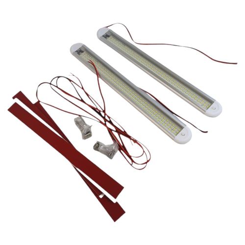 Zestaw Kompletny: Zestaw obejmuje 2 sztuki listw świetlnych LED, taśmy dwustronne, zatrzaski i śruby, zapewniając kompletną gamę elementów montażowych.