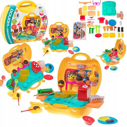 Zestaw zawiera 5 tubek masy plastycznej o różnych kolorach oraz dodatkowe narzędzia, takie jak foremki, nożyk i łyżki, które umożliwią dziecku tworzenie przeróżnych kształtów. W walizce znajdują się również maszynka do wyciskania wafelków do lodów, foremki do burgerów, akcesoria do robienia popcornu.