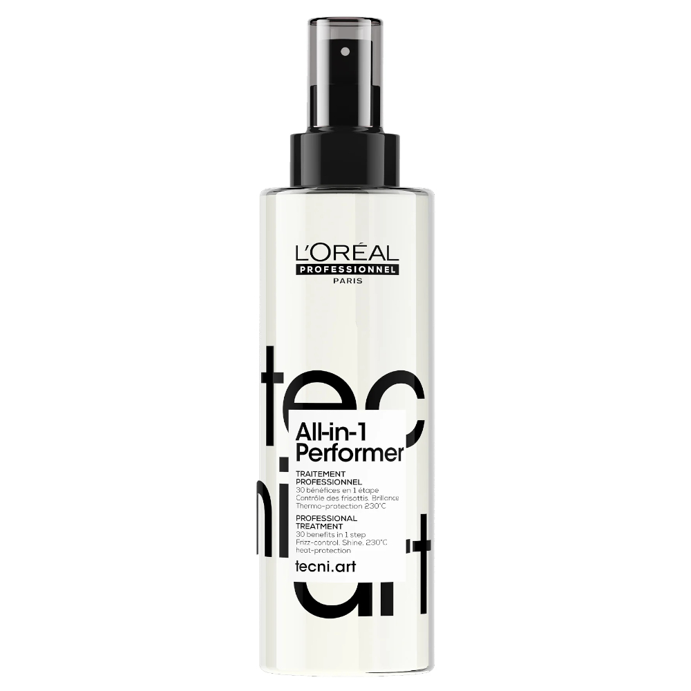 L’Oréal Professionnel Tecni.Art All In One Performer to praktyczny, wszechstronny spray, który ułatwia codzienną stylizację i pielęgnację włosów. Formuła łączy funkcje ochronne, wygładzające oraz kondycjonujące, dzięki czemu produkt sprawdza się zarówno podczas pracy w salonie, jak i w domowej rutynie. Spray pomaga utrzymać fryzurę w ryzach przez cały dzień, jednocześnie poprawiając wygląd i kondycję pasm.