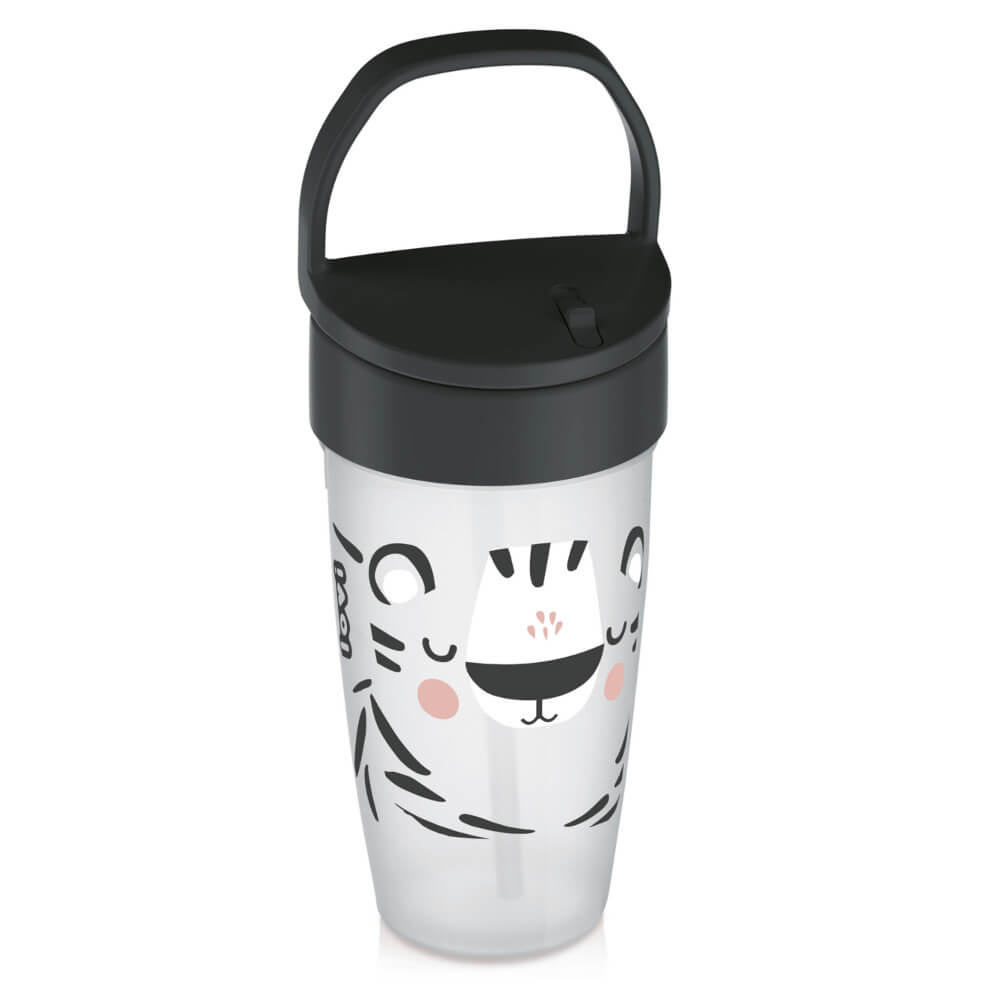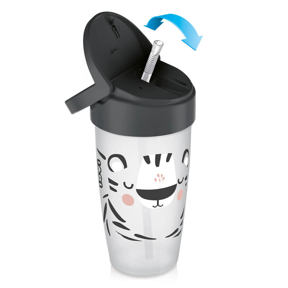 Kubek wyposażono w miękką, silikonową słomkę, która jest bezpieczna dla wrażliwych dziąseł i odpowiednia dla aktywnych maluchów. Jej długość została zaprojektowana w taki sposób, by napój nie miał stałego kontaktu z ząbkami, co wspiera zdrowe nawyki i higienę jamy ustnej.